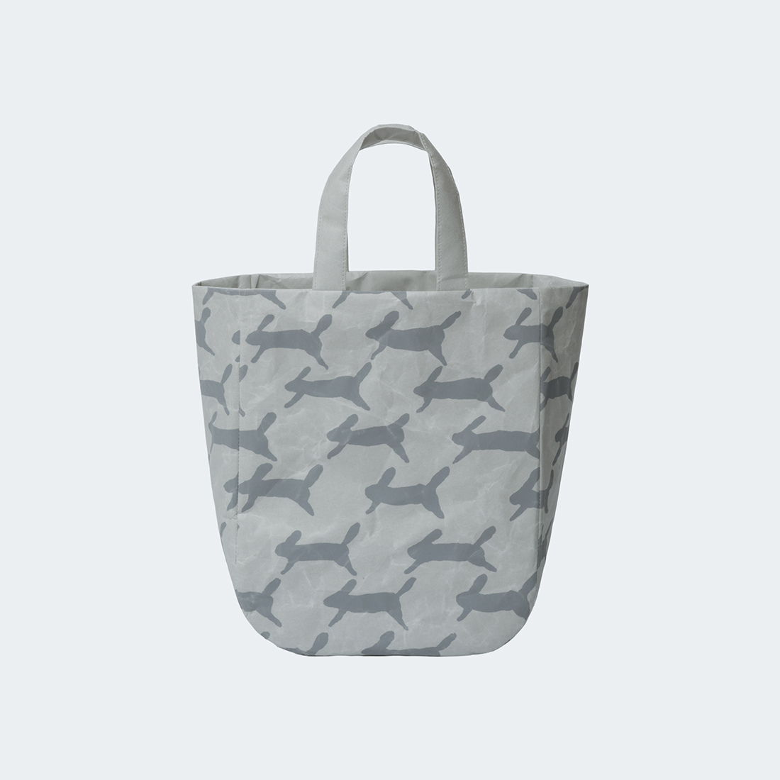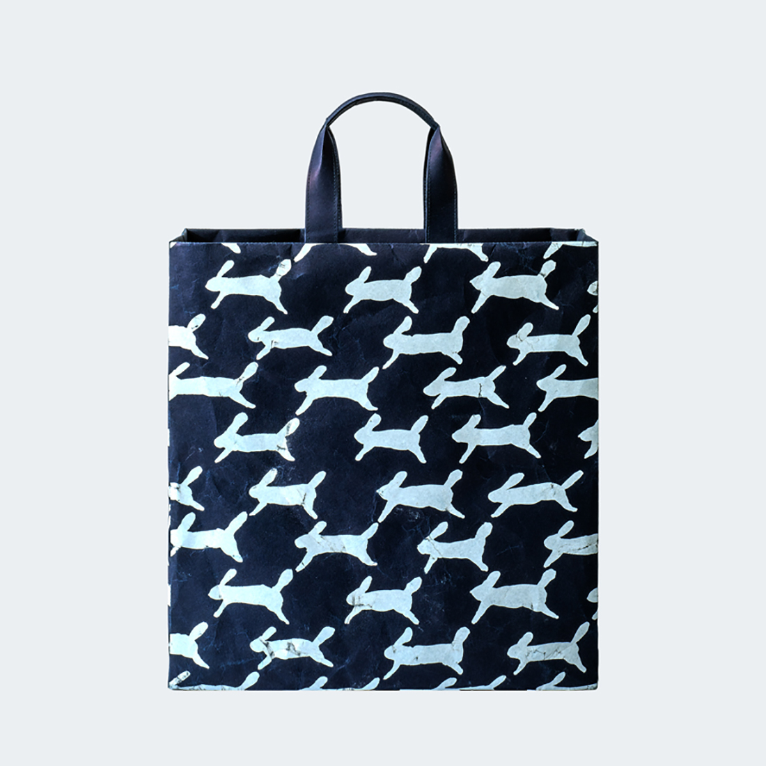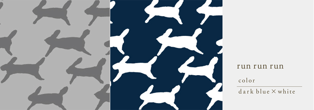 千鳥格子のような連続模様を、うさぎで描かれた図案です。手描きから生まれた絵の具の濃淡やにじみ、かすれもそのままに表現されています。うさぎたちが楽しく駆けていく様子がうかがえる軽やかで優しいデザインです。
