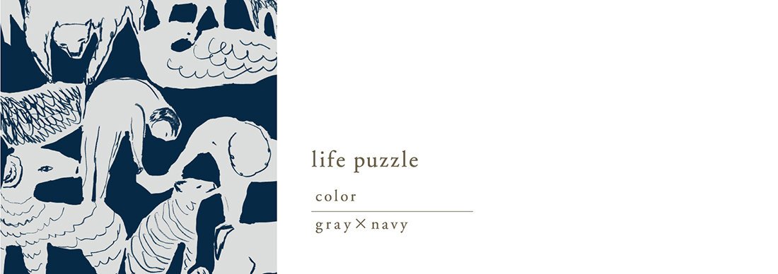 フリーハンドで描かれた様々な動物がパズルのピースのように連なった景色が描かれています。思い思いに生きているそれぞれの命が穏やかに繋がっていく世界を想像して生まれた図案です。