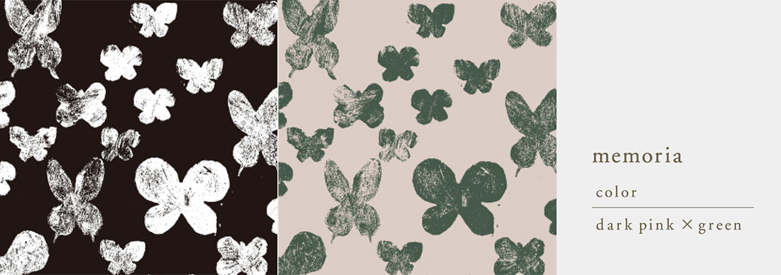 ゴム版で一つひとつ制作し、筆の刷目の跡を残しながらひらひらと舞う蝶の姿が描かれています。そのタッチからは、蝶たちが舞った影の残像をイメージさせ、遠い記憶の中にある景色を想像させます。