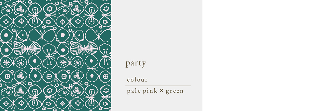 ちょうちょたちが「パーティ」に集まっている様子が描かれています。さまざまな模様の羽を広げ、楽しくにぎやかに野を遊んでいる姿を表現したおおらかな図案です。ところどころ羽を休めたちょうちょもいます。