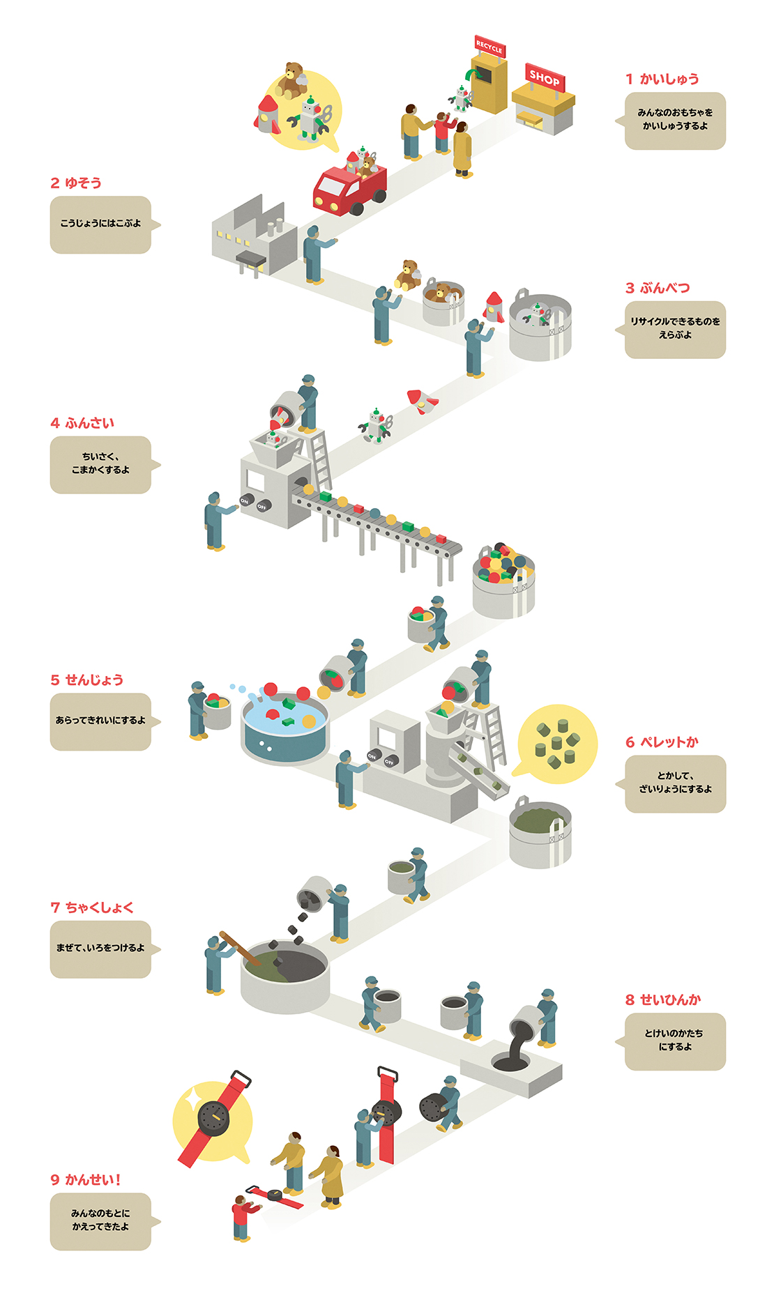 みんなに優しい時間をコツコツ刻む。そんな思いから使われなくなった玩具を再生して作ったリサイクル樹脂を原料にしています。