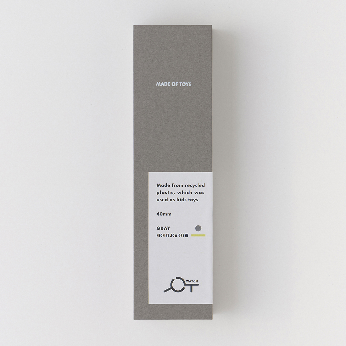 子どもたちにも使っていただく腕時計、ということで、使われなくなった玩具を回収し原料にしたリサイクル樹脂から本体とベルトを製造。廃棄されたものの時間の針をぐるりと前へ戻す。みんなに優しい時間をコツコツ刻む。そんな思いからこの製品に玩具の「TOY」をひっくり返して「YOT」。「YOT Watch」という名前を付けました。