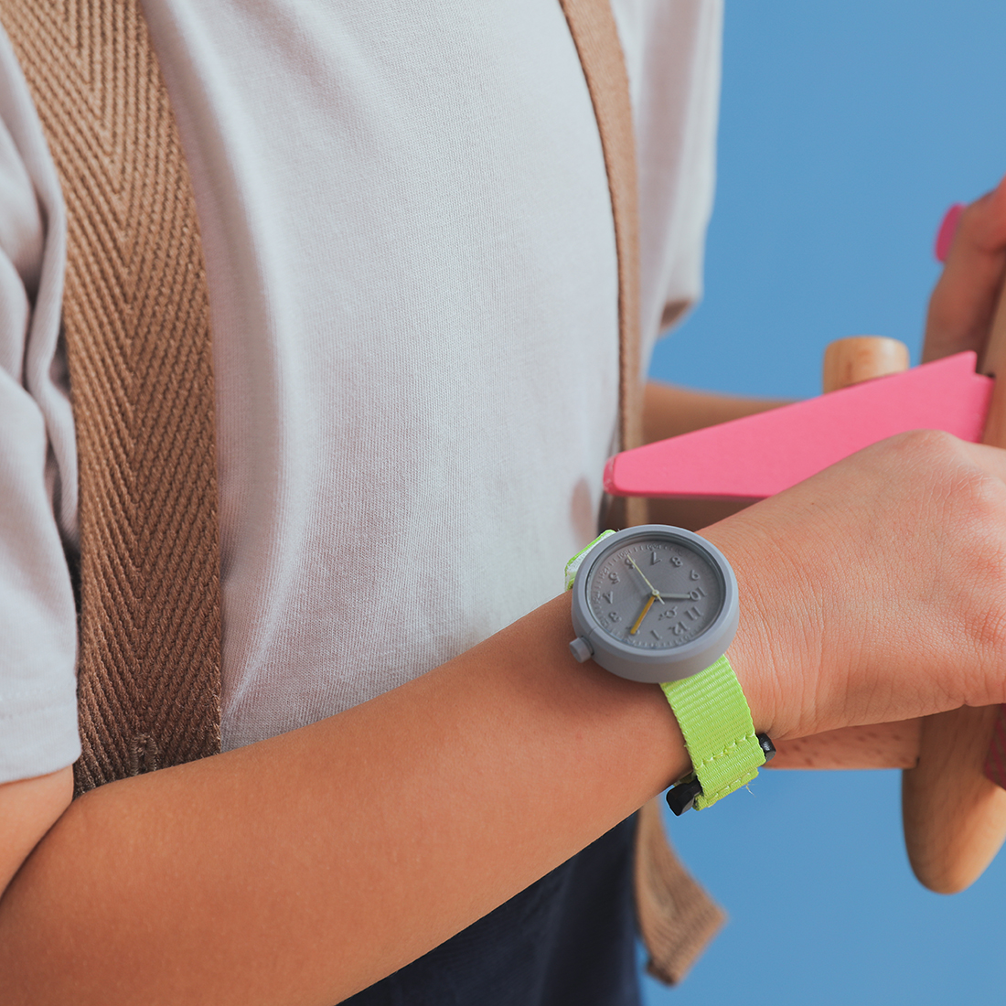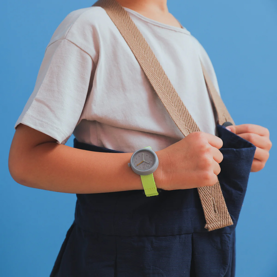 キッズバージョンは本体の文字盤も特別仕様。時間と分の数字を表記し、さらに長針は黄色に彩色、時間の読み取りやすさに配慮しました。また子どもたちが着脱しやすいようにベルクロ式のベルトを装備しています。