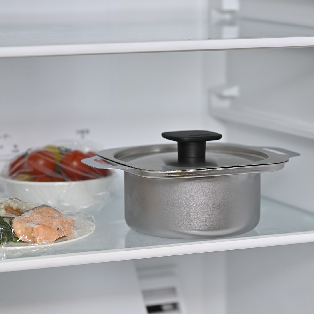 洗米後、約30分ほど浸水させます。この時、「rice cooker Duo」の「蒸気炊飯」の効果を最大限に活かすために、冷蔵庫で鍋ごと冷やしていただくのが最適です。「Duo」の内鍋は高さ11センチ、横幅20センチと、とてもコンパクトですから、冷蔵庫の空いた場所に置くことが可能。これによってよりゆるやかな温度上昇が見込め、さらに美味しいご飯が炊き上がります。