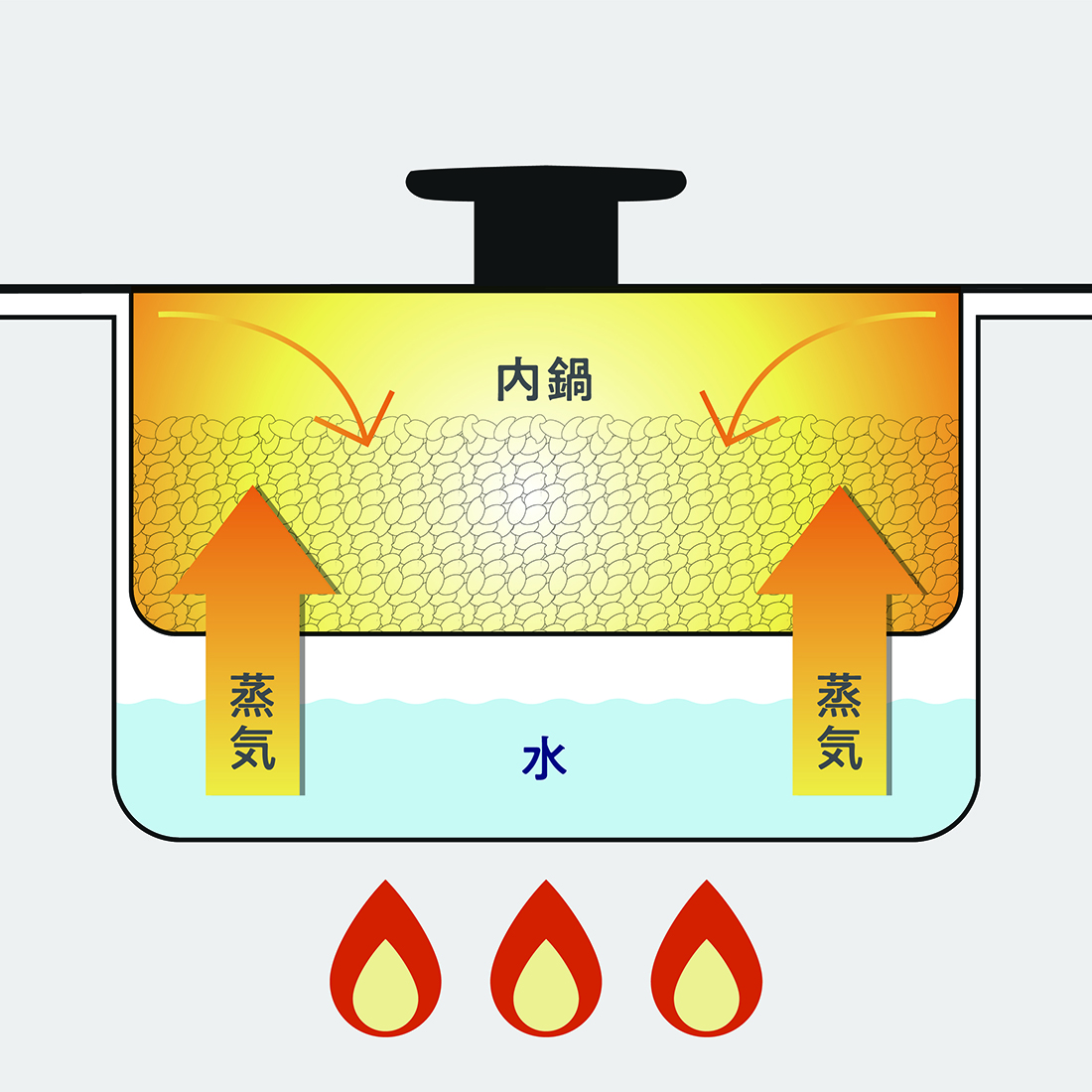 「Duo」はステンレス二重構造で、外鍋に水を入れ加熱するだけ。蒸気穴から内鍋へ流れ込む蒸気の力で、お米にゆっくり火が通る仕組みです。 そのため火加減なしで焦げずにふっくら、つやつやのご飯が炊き上がります。