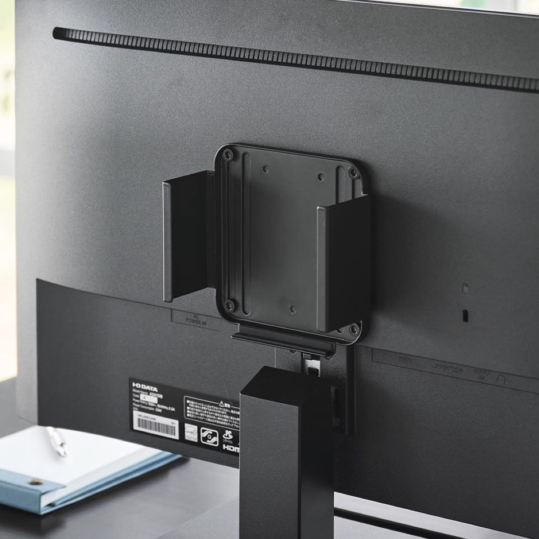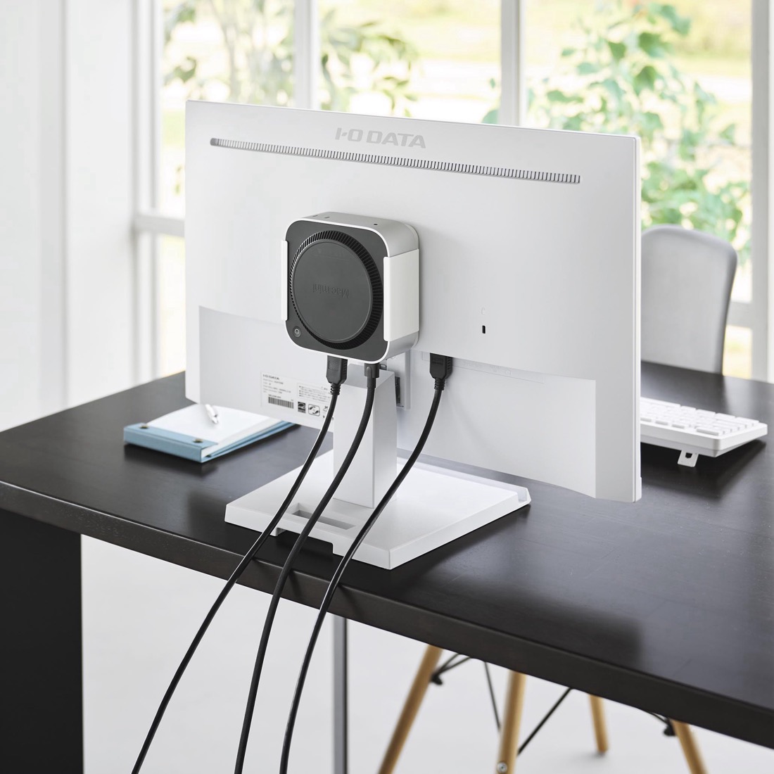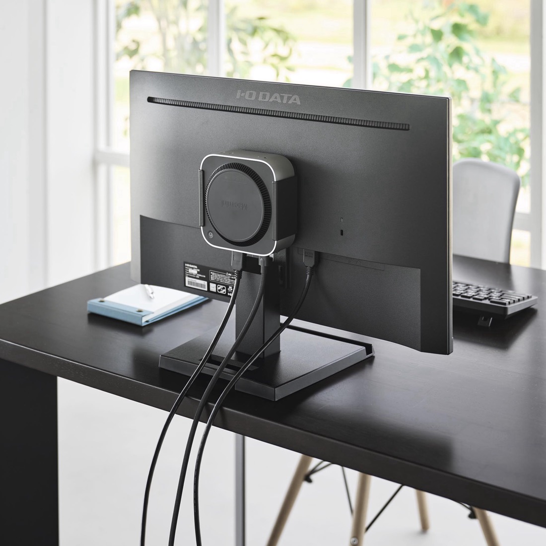 さらにVESA規格対応のネジ穴を備えた一般的なディスプレイなら、液晶裏に固定が可能。デスクの上を広く取ることができ、大型ディスプレイに固定すればiMacのような使い方が実現します。
