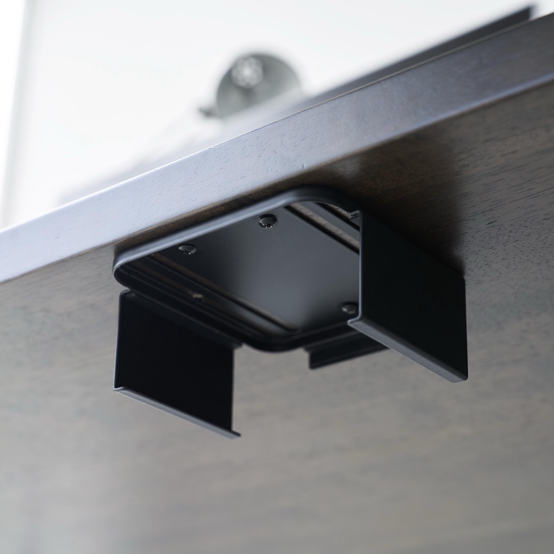 デスク下に取り付ける場合は、付属の直径3.5ミリ、長さ1.5ミリの木ねじを使用して、3点で固定します。取り付けが可能なデスクの天板は、木製もしくは積層合板製で、厚さが1.5センチ以上あることが条件です。