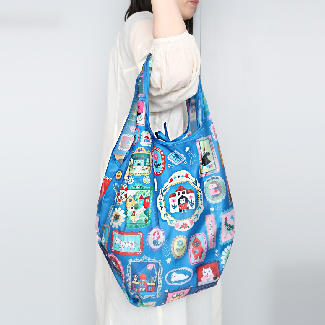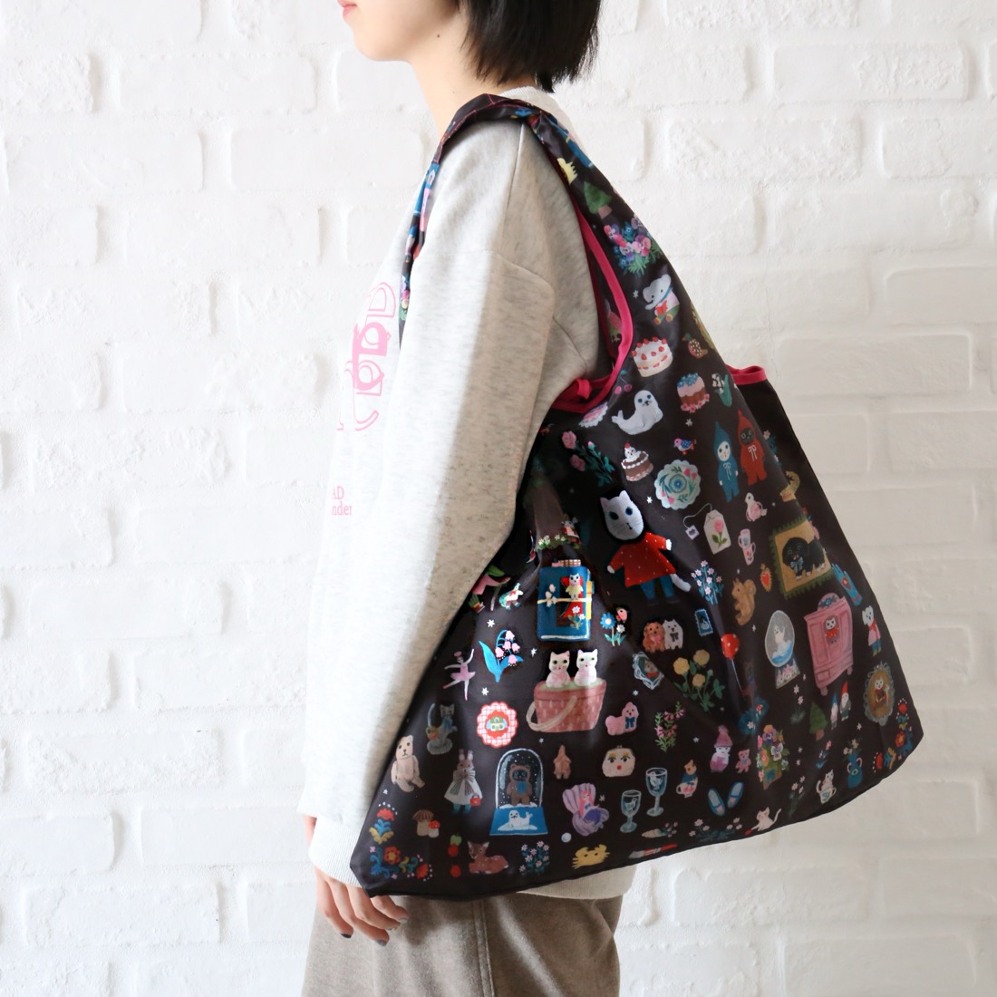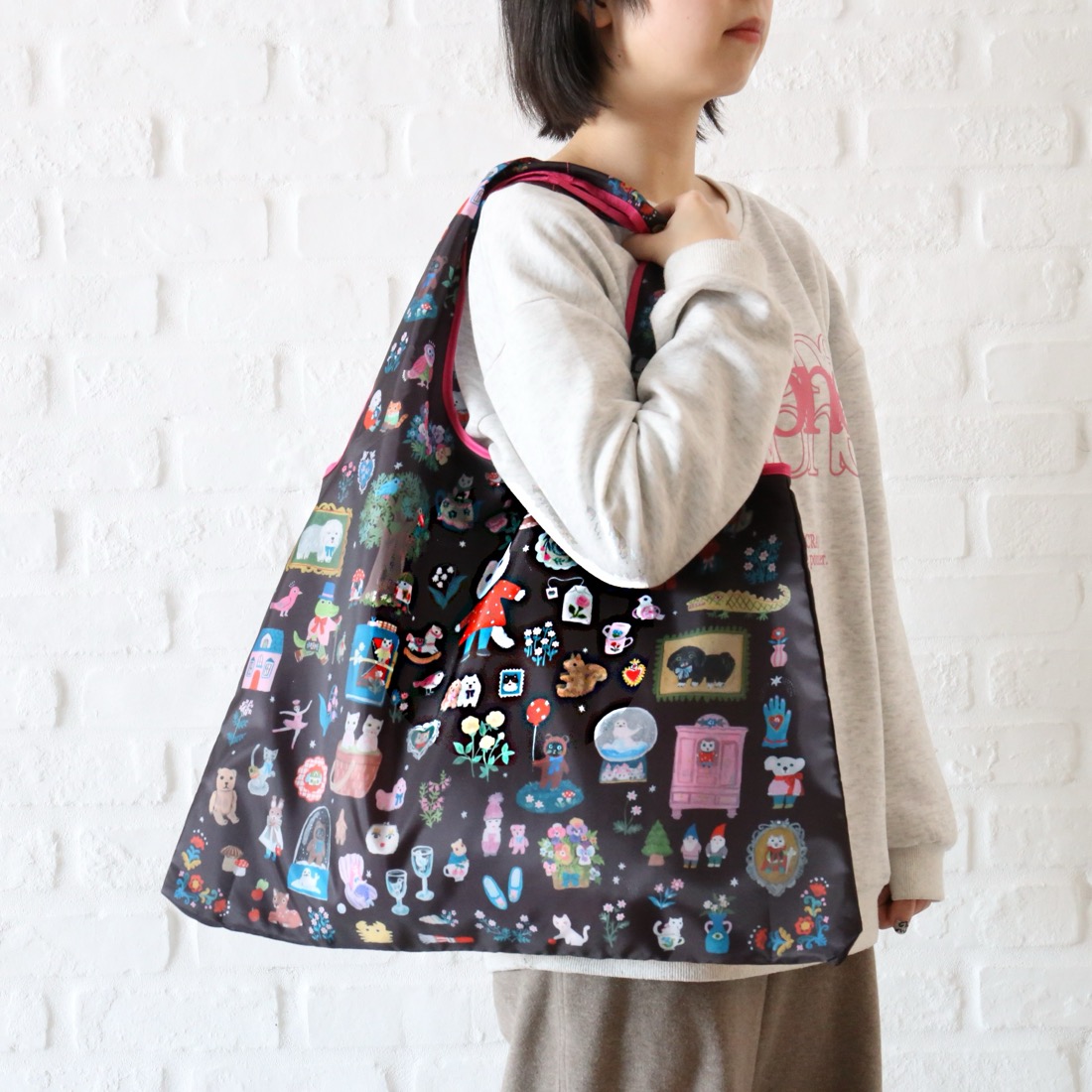 「絵本のデイリーバッグ」はその使いやすさもしっかり考えました。サイズはたっぷりの大型サイズ。一般的な折り畳み式のエコバッグとは異なり、その収納力と、バッグとしての使いやすさも充実。