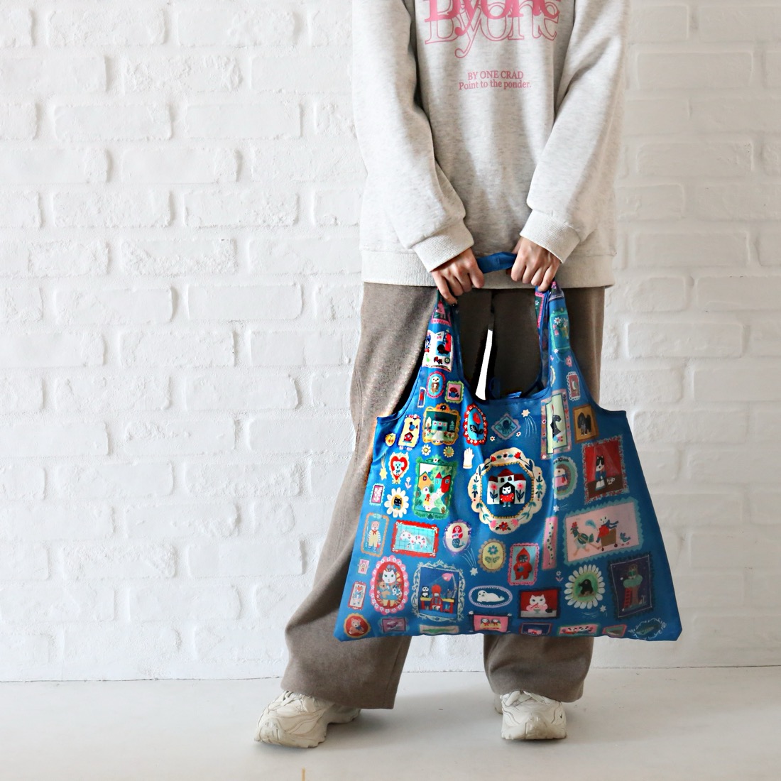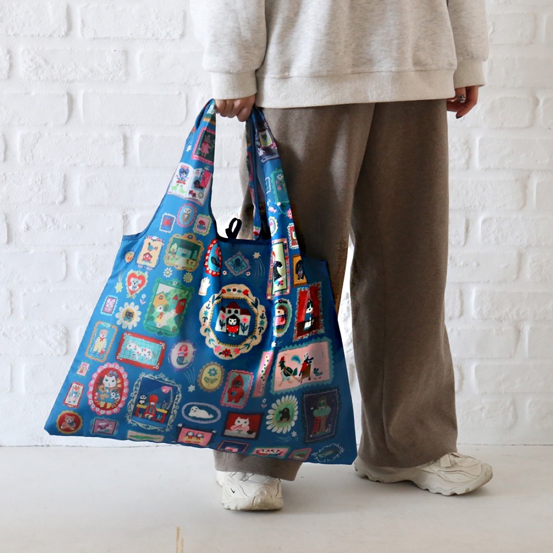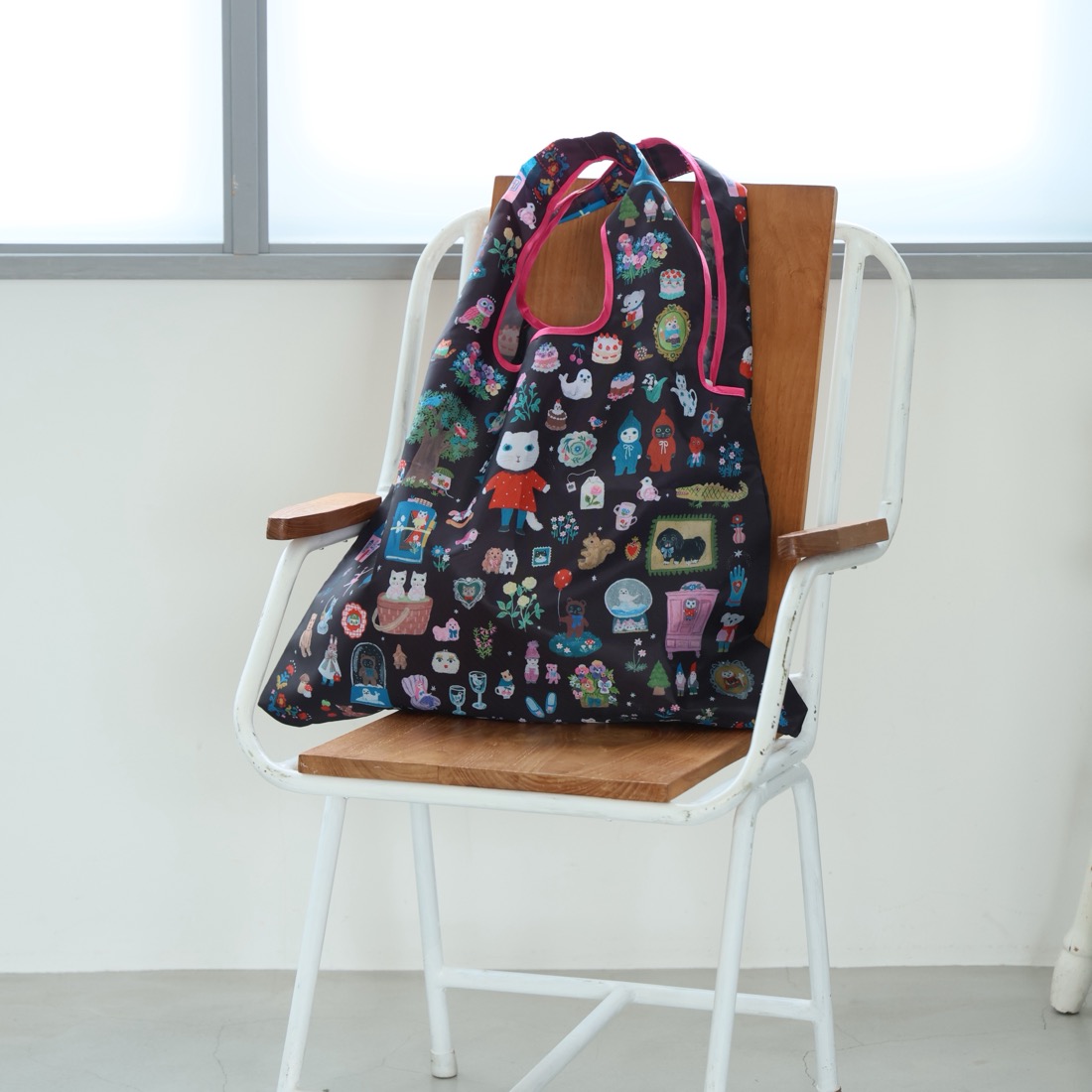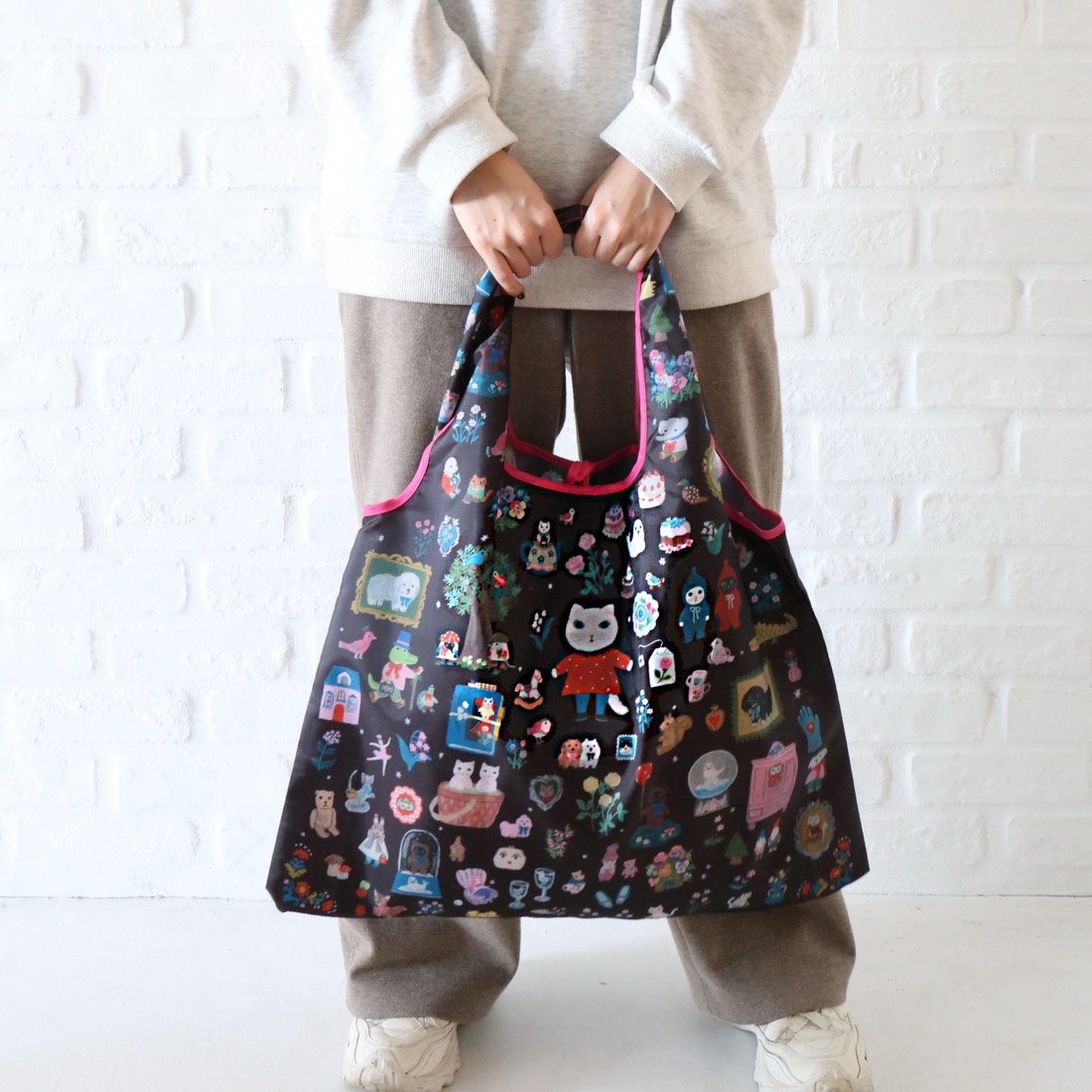 「絵本のデイリーバッグ」はその使いやすさもしっかり考えました。サイズはたっぷりの大型サイズ。一般的な折り畳み式のエコバッグとは異なり、その収納力と、バッグとしての使いやすさも充実。