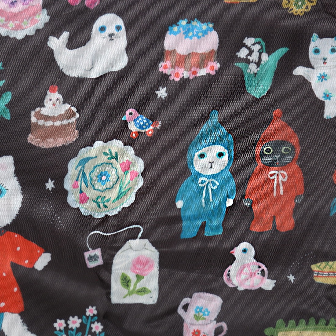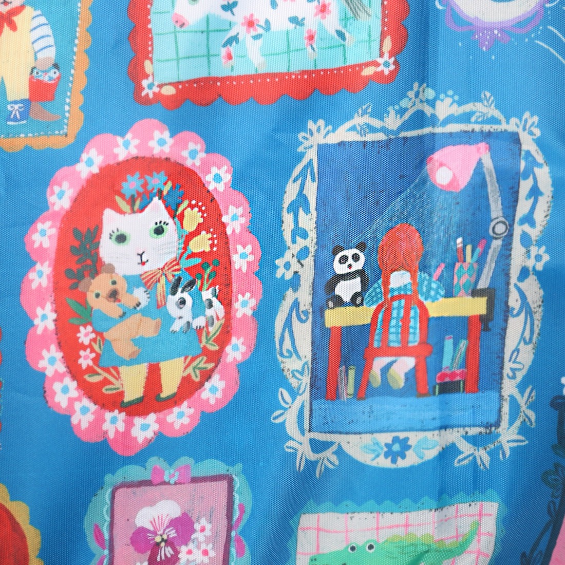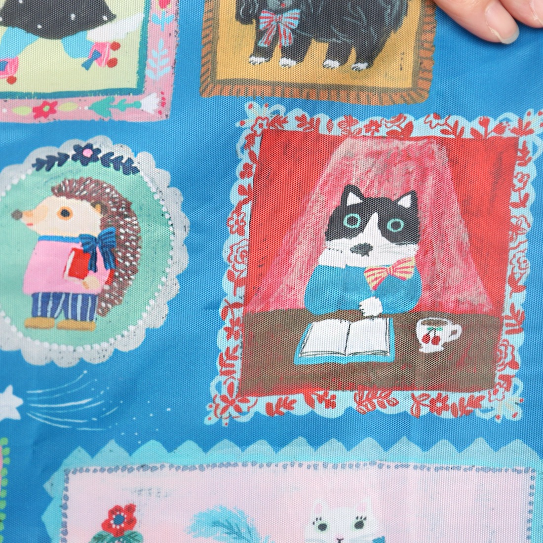 テキスタイルデザインは、イラストレーターの北岸由美さんに依頼。あたたかみのある手描きタッチと豊かな色使い、チャーミングなキャラクターが登場する、まるで一冊の絵本を読んでいるようなデザインに仕上がりました。