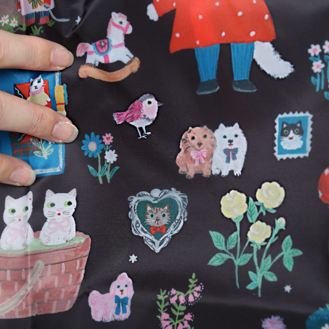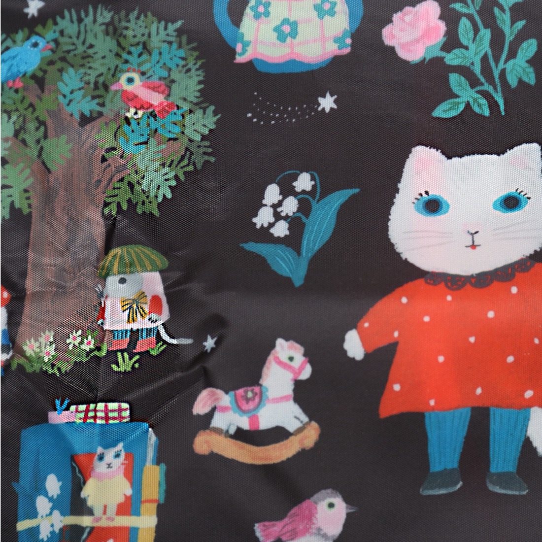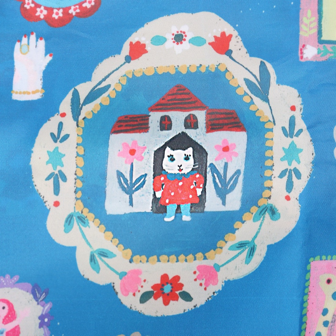 テキスタイルデザインは、イラストレーターの北岸由美さんに依頼。あたたかみのある手描きタッチと豊かな色使い、チャーミングなキャラクターが登場する、まるで一冊の絵本を読んでいるようなデザインに仕上がりました。