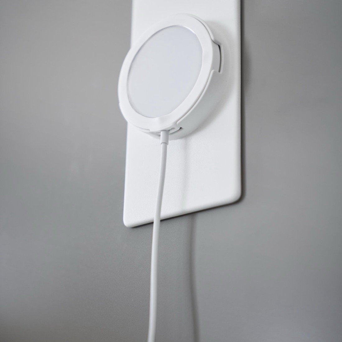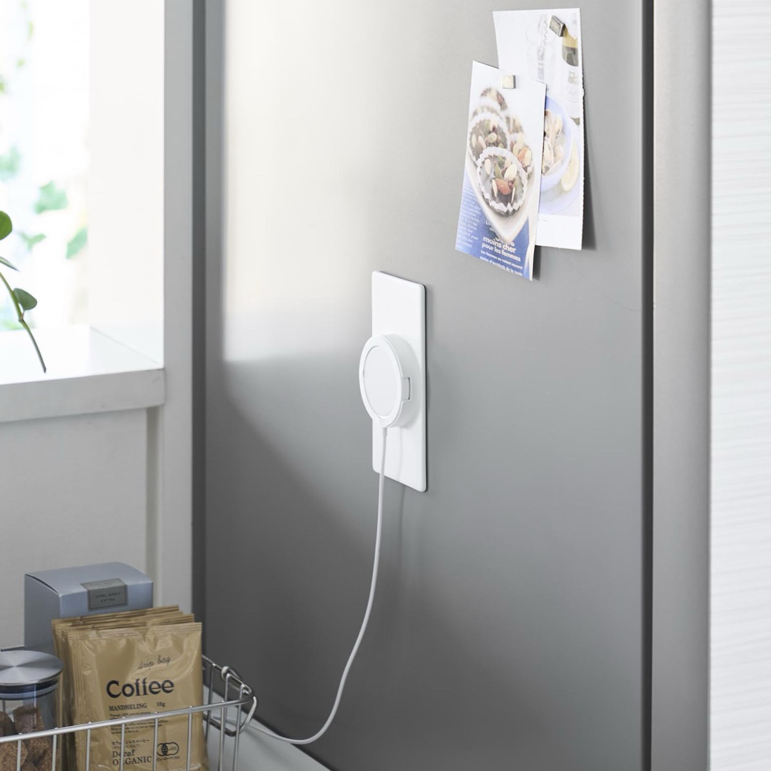 Apple純正のMagSafe充電器をデスクプレートや冷蔵庫などの金属面に固定。机の上を占有しない、充電ステーション。