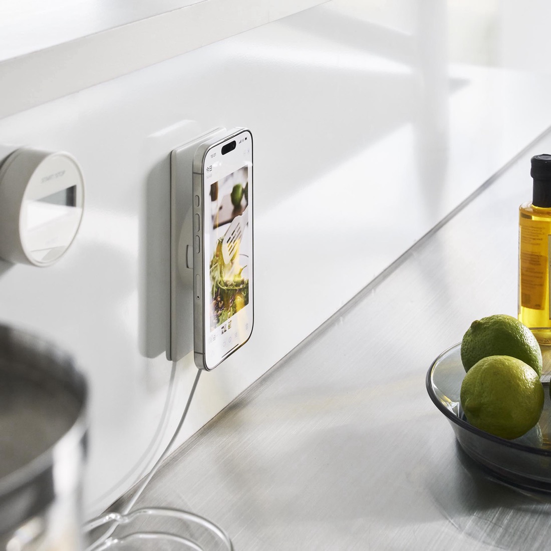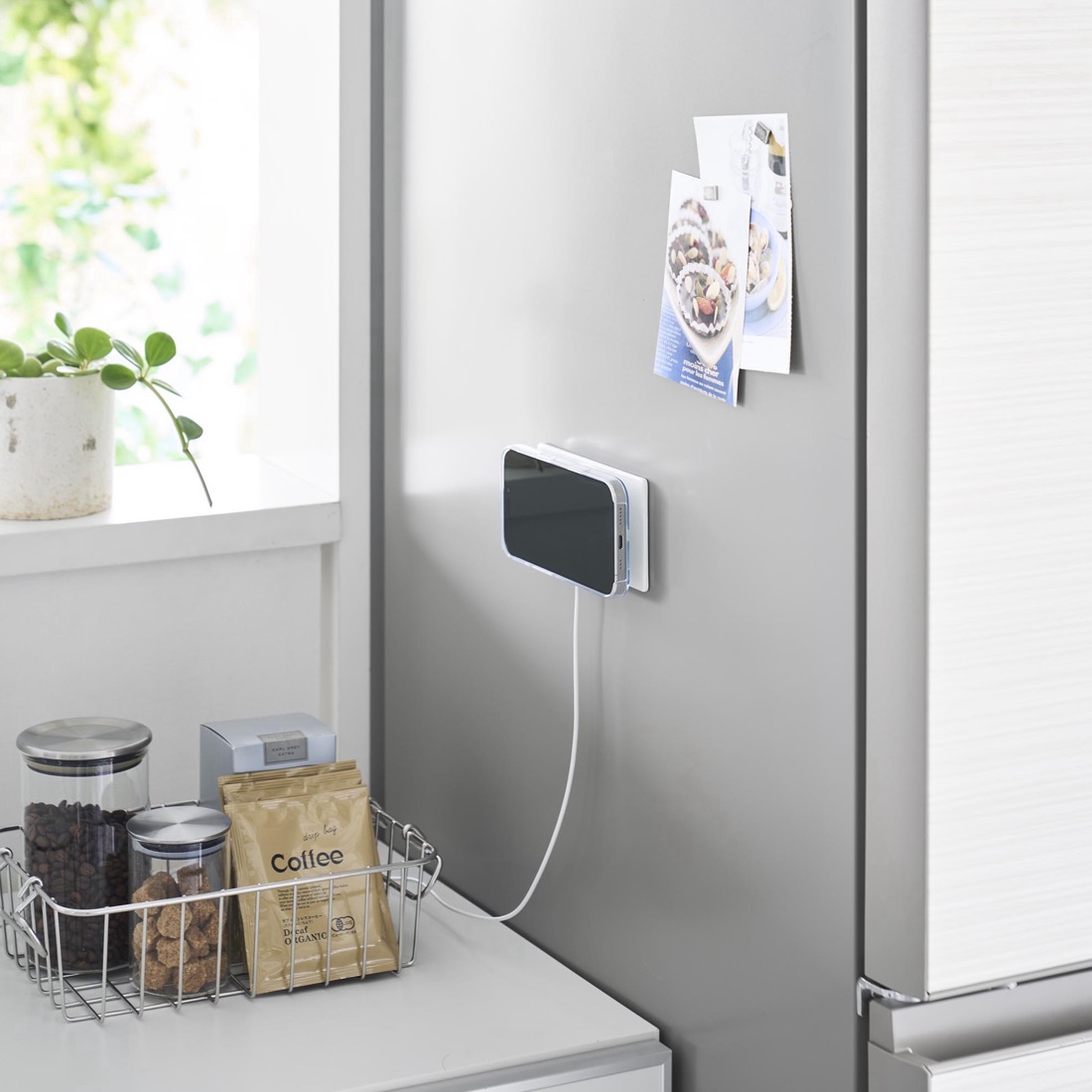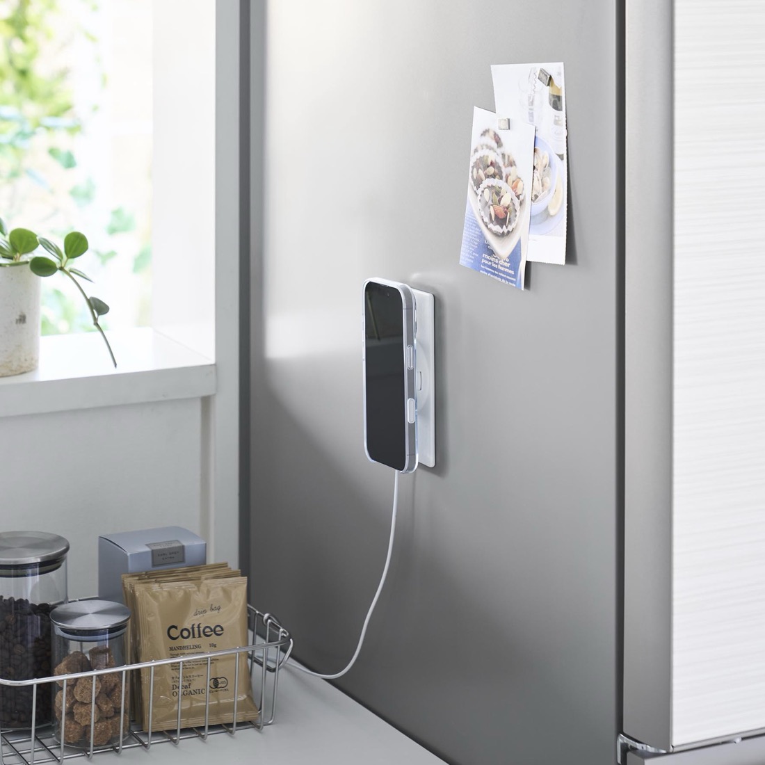 Apple純正のMagSafe充電器を、マグネットで固定。金属の壁面やデスクボード、冷蔵庫の側面を使って、iPhoneを固定して、充電しながら使用することができる、これまでになかった便利な充電アダプターです。