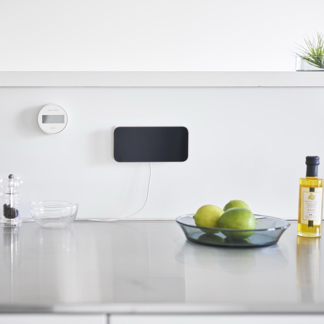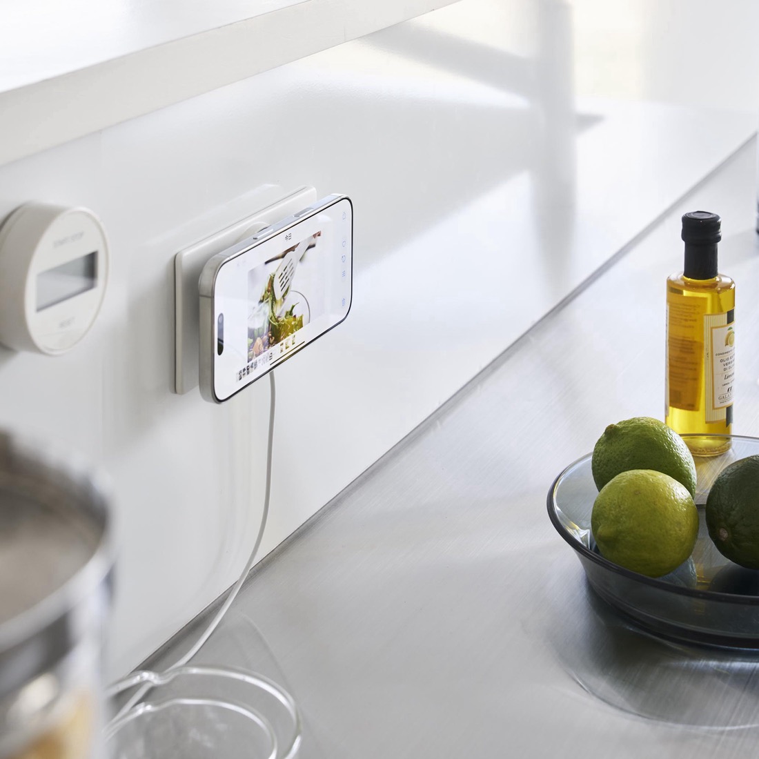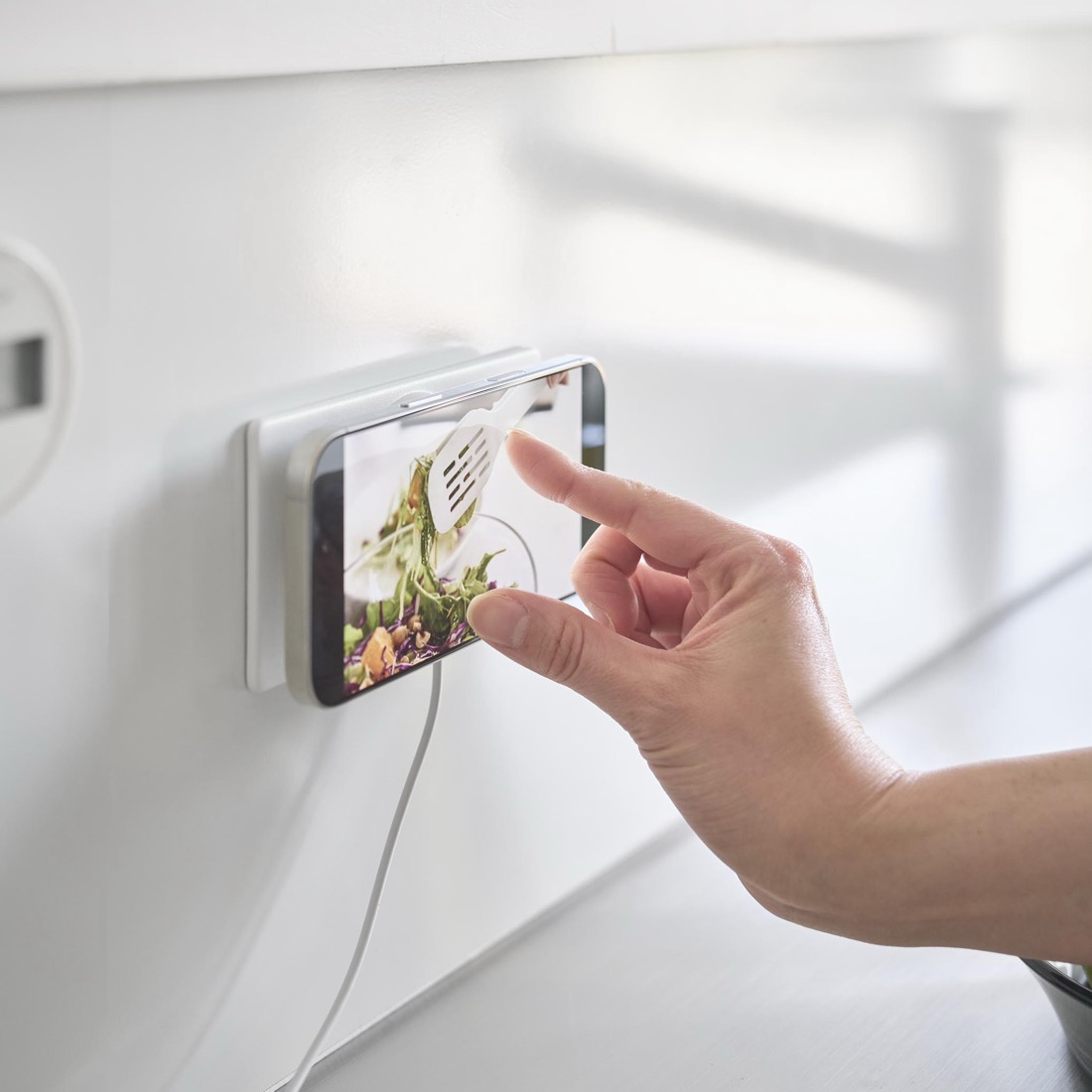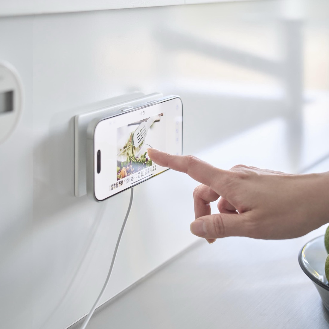 壁面に取り付けたまま、動画やPodcastを楽しんだり、横向きに固定してiPhoneに時計を表示させるスタンバイモードにしたり。固定するだけではなく、iPhoneをそのまま充電できることが何より大きな特徴です。