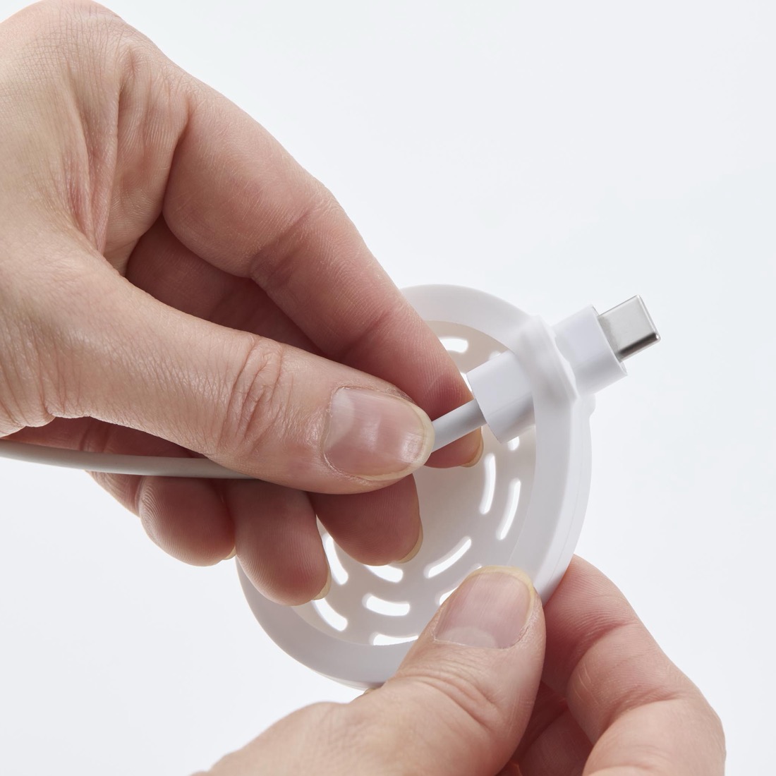Apple純正MagSafe充電器のシリコーン製アダプターです。まずケーブルを通してからアダプターにすっぽり包み込む構造。充電器本体のプレートに傷をつけることなく取り付けができて、しっかり固定ができるアダプターが付属しています。
