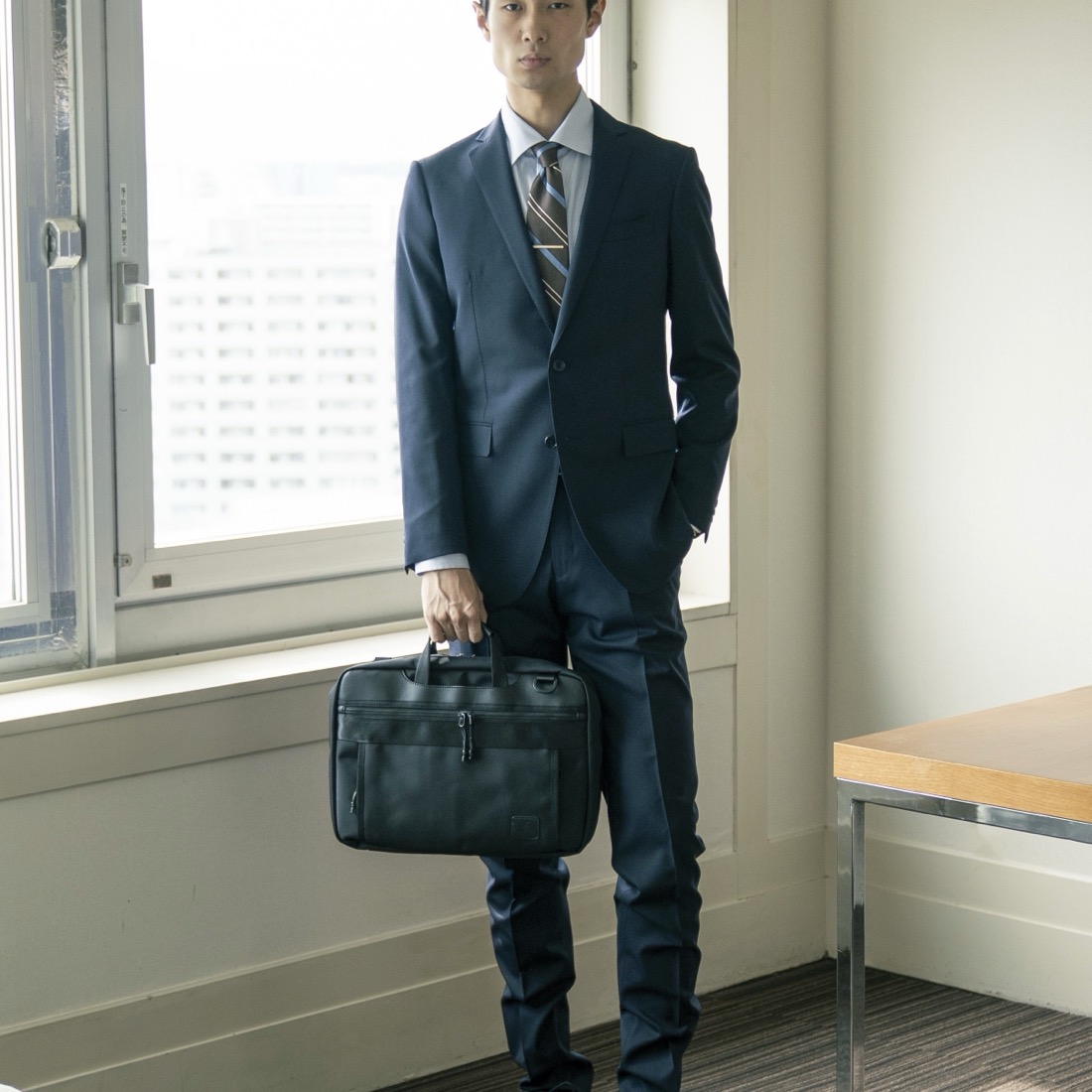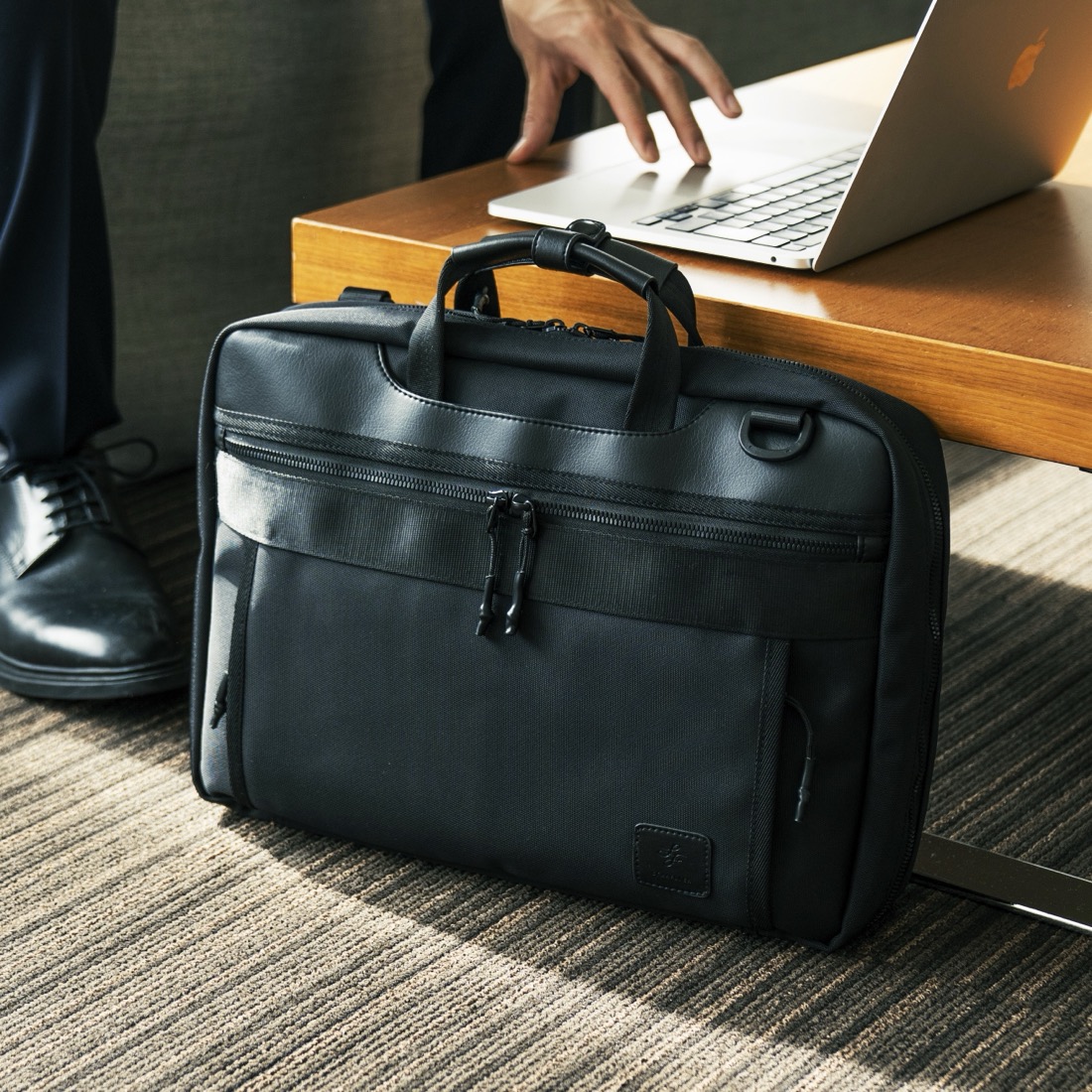 本体は上品な質感のあるポリエステル製。手触りは優しく、しかし強靭で軽量。艶消しのブラック素材で、バッグ上面にはポリエステル製のベルトと合成皮革を組み合わせることでシンプルに仕上げ、スーツ姿はもちろんカジュアルな服装にもぴったりなバッグです。