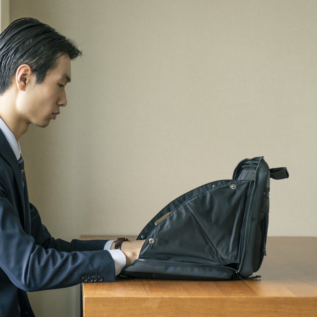 優しいシルエットのソフトシェル・バックパック。スーツやジャケット姿での背負いやすさ、モノの出し入れの配慮から生まれた形「TRIM backpack」3705