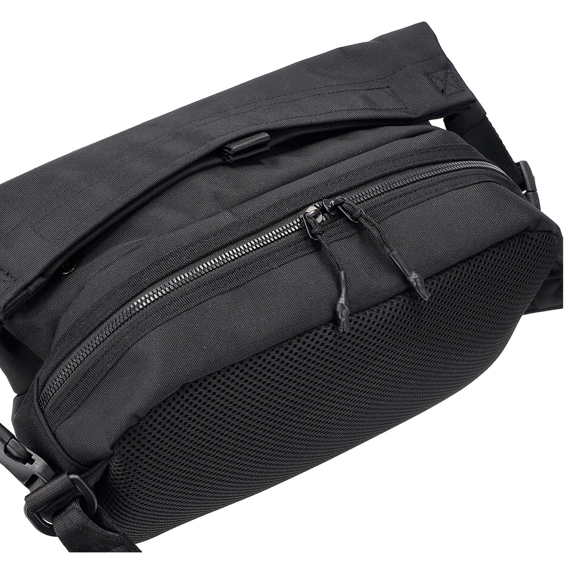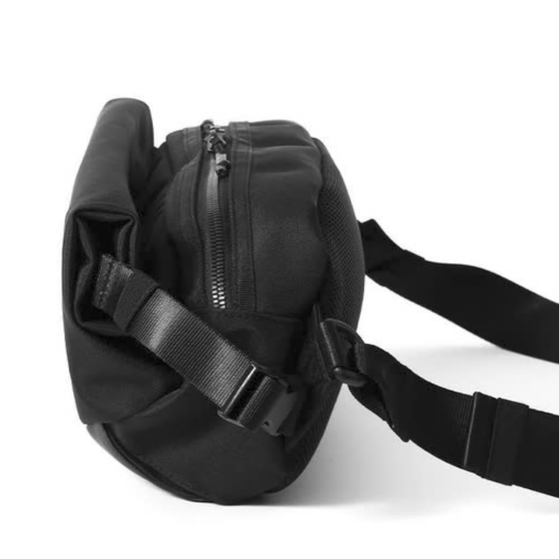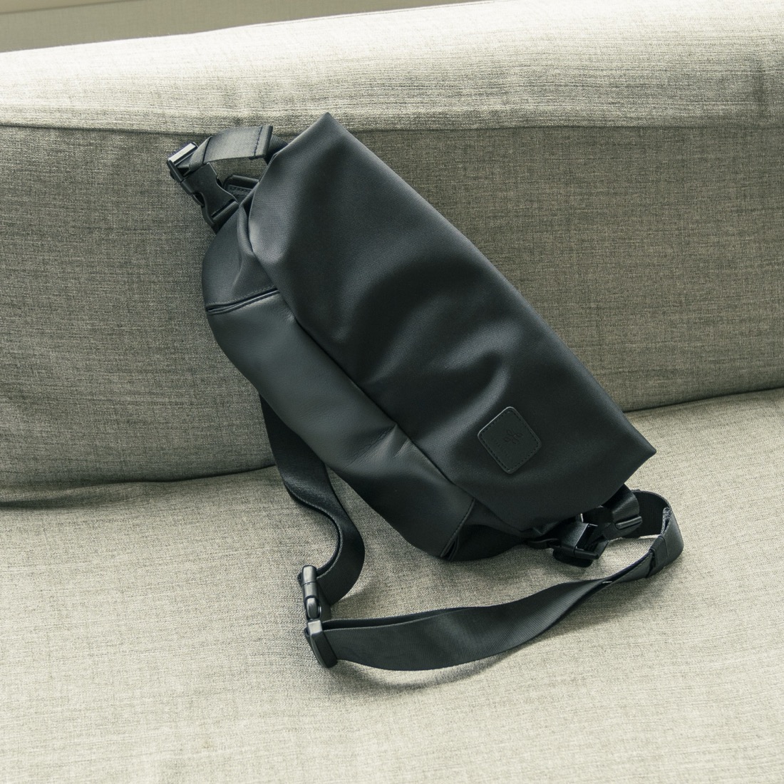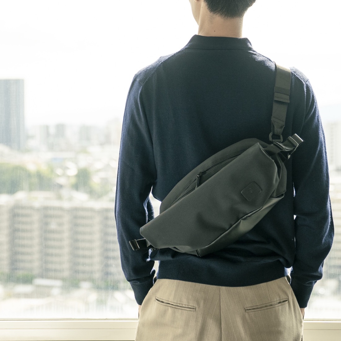街歩きに仕事に、旅や出張にも。軽量で薄型、オールブラックのボディバッグ。荷物が増えた時には収納部の容量を自由に拡張可能