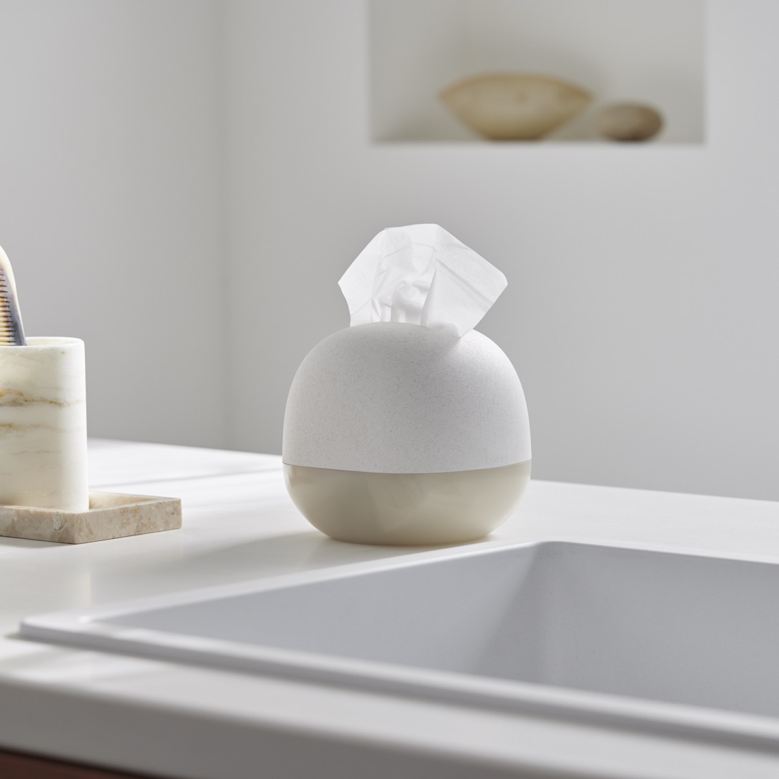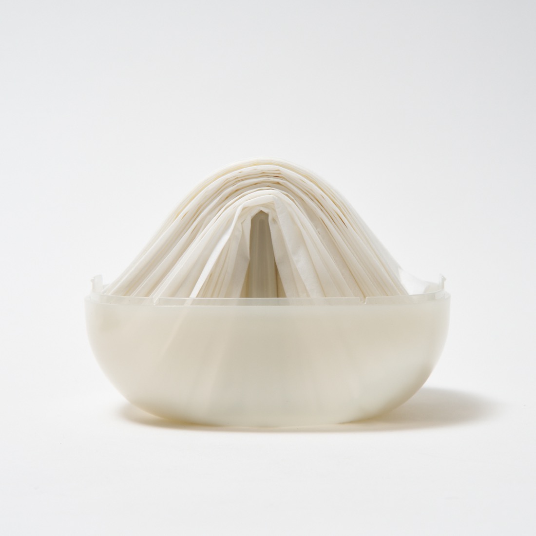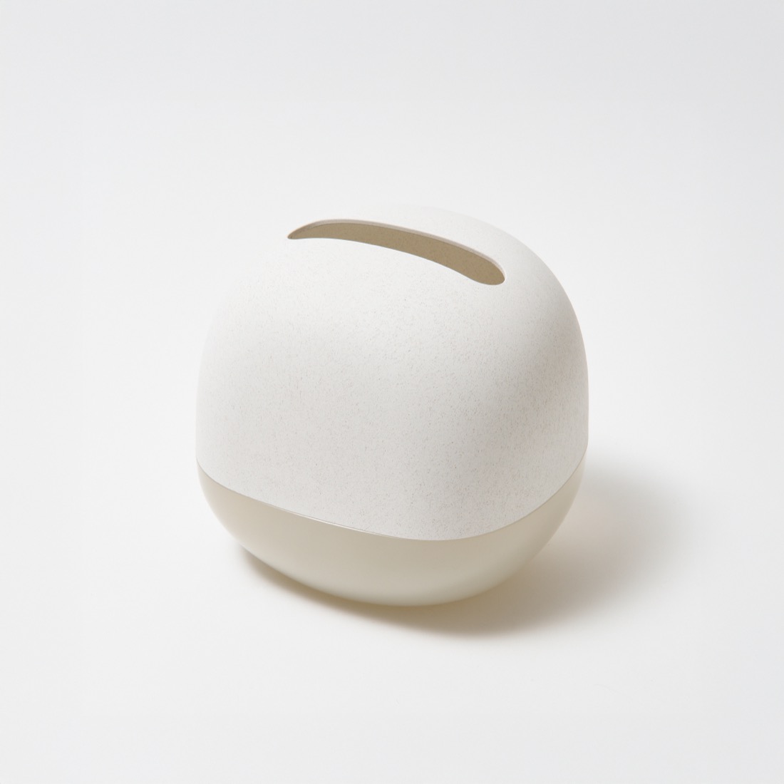 既存品で評価された、インテリアアクセサリーとしてひと目見たときに「欲しい」と思ってもらえる愛らしいフォルムは意識しつつ、今回のモデルでは中に収納するティッシュを二つ折りにすることで、より省スペースで設置でき、かつ箱ティッシュのサイズ感でも入る形状を目指しました。